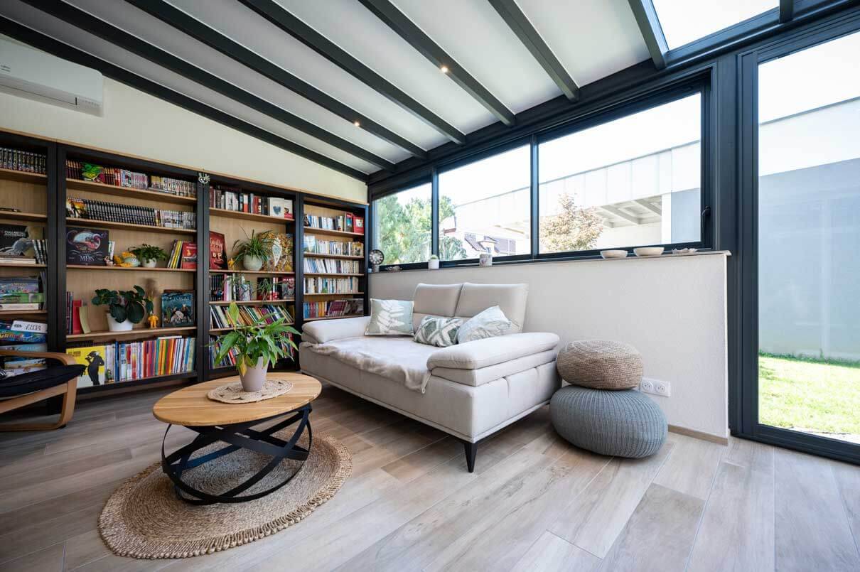 compromis. Il existe également d’autres options pour profiter de cet espace toute l’année et sans compromis : des coulissants en triple vitrage pour se protéger du froid, des panneaux de toiture pour un haut pouvoir isolant ou encore l’option volets roulants pour occulter la pièce et augmenter l’isolation thermique.