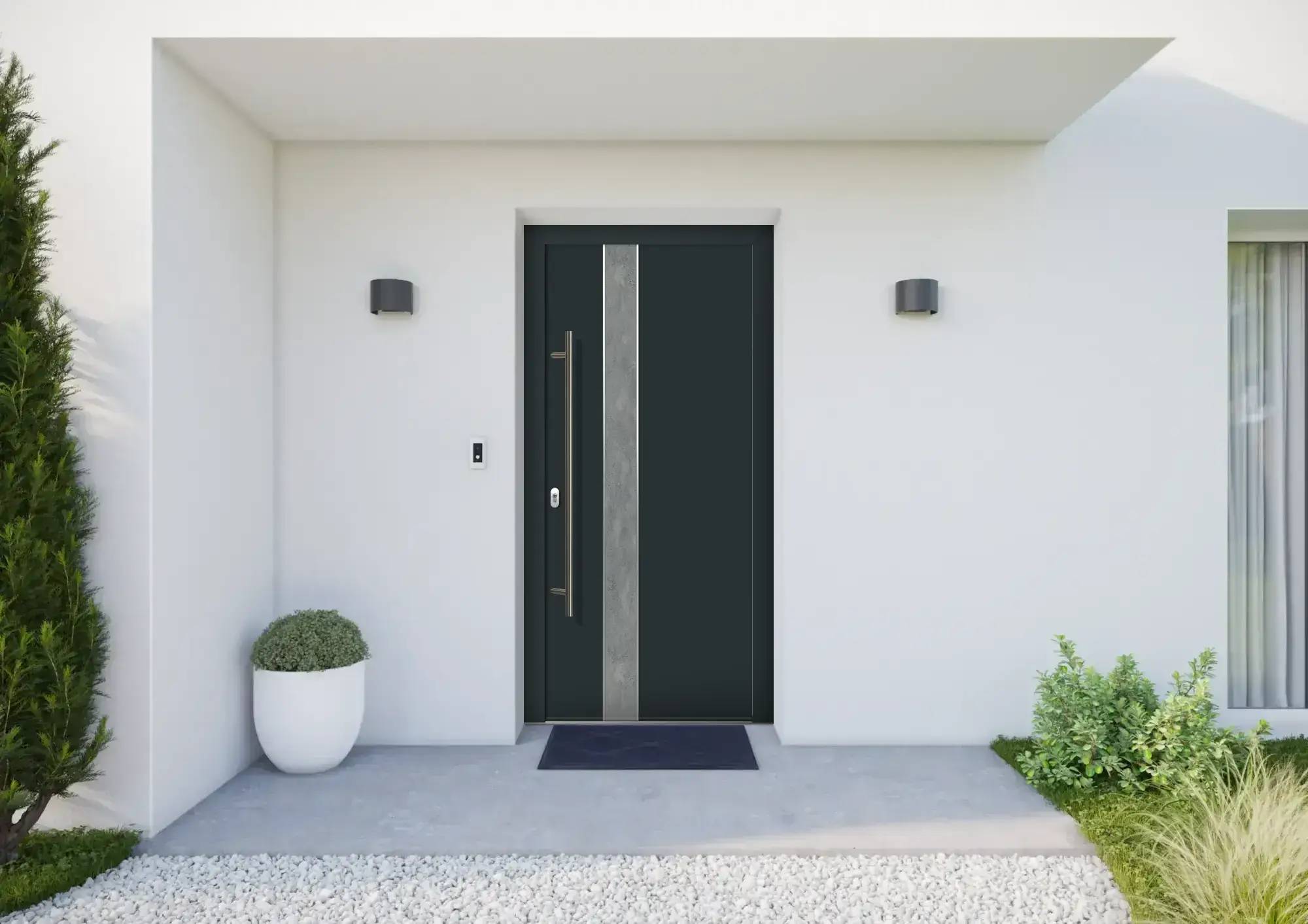 Porte d’entrée monobloc panneau plein Berenice beton Le choix du confort et de la tranquillité.