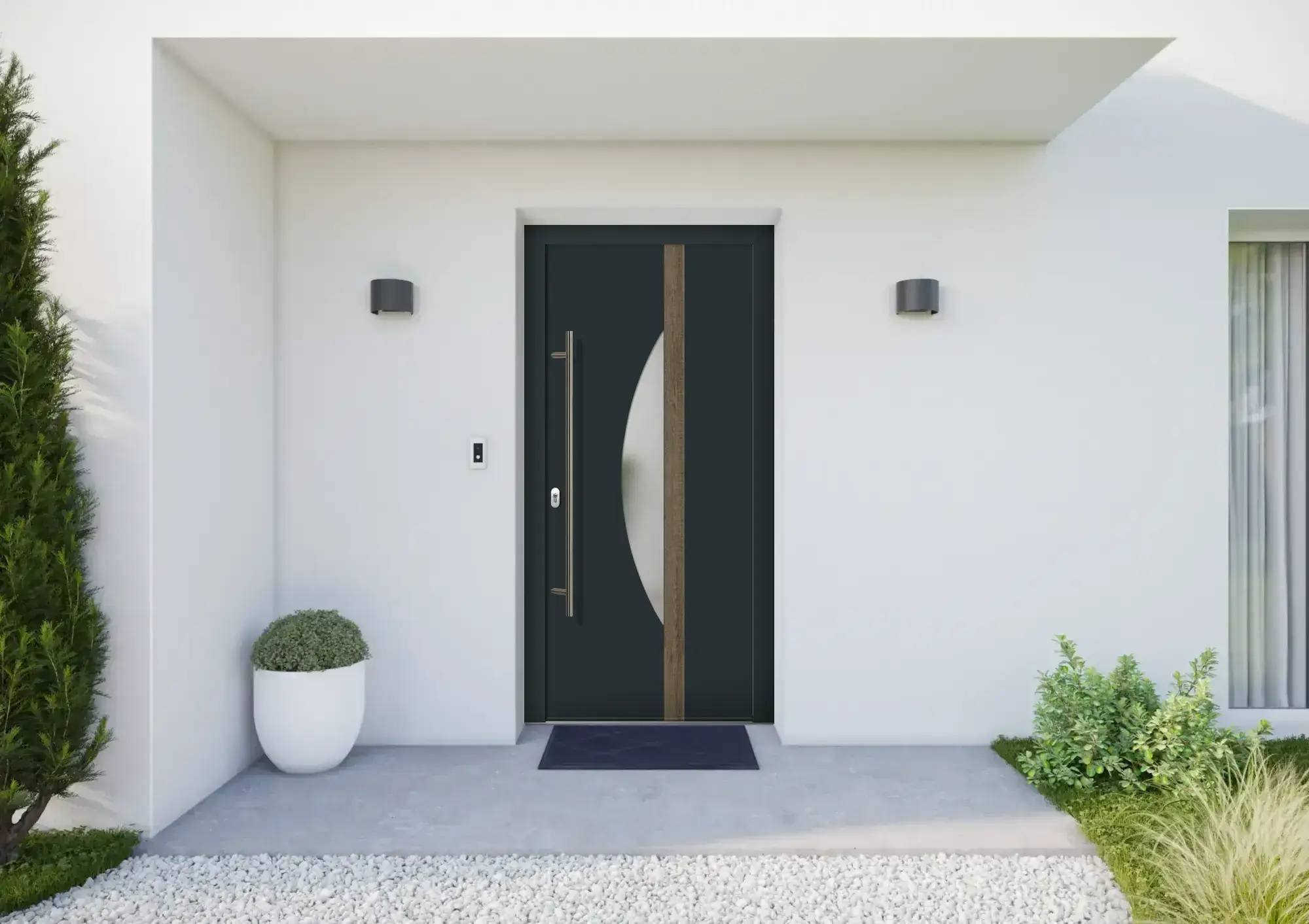 Porte d'entrée moderne blanche avec cinq fenêtres rectangulaires et une plante verte en pot à proximité.