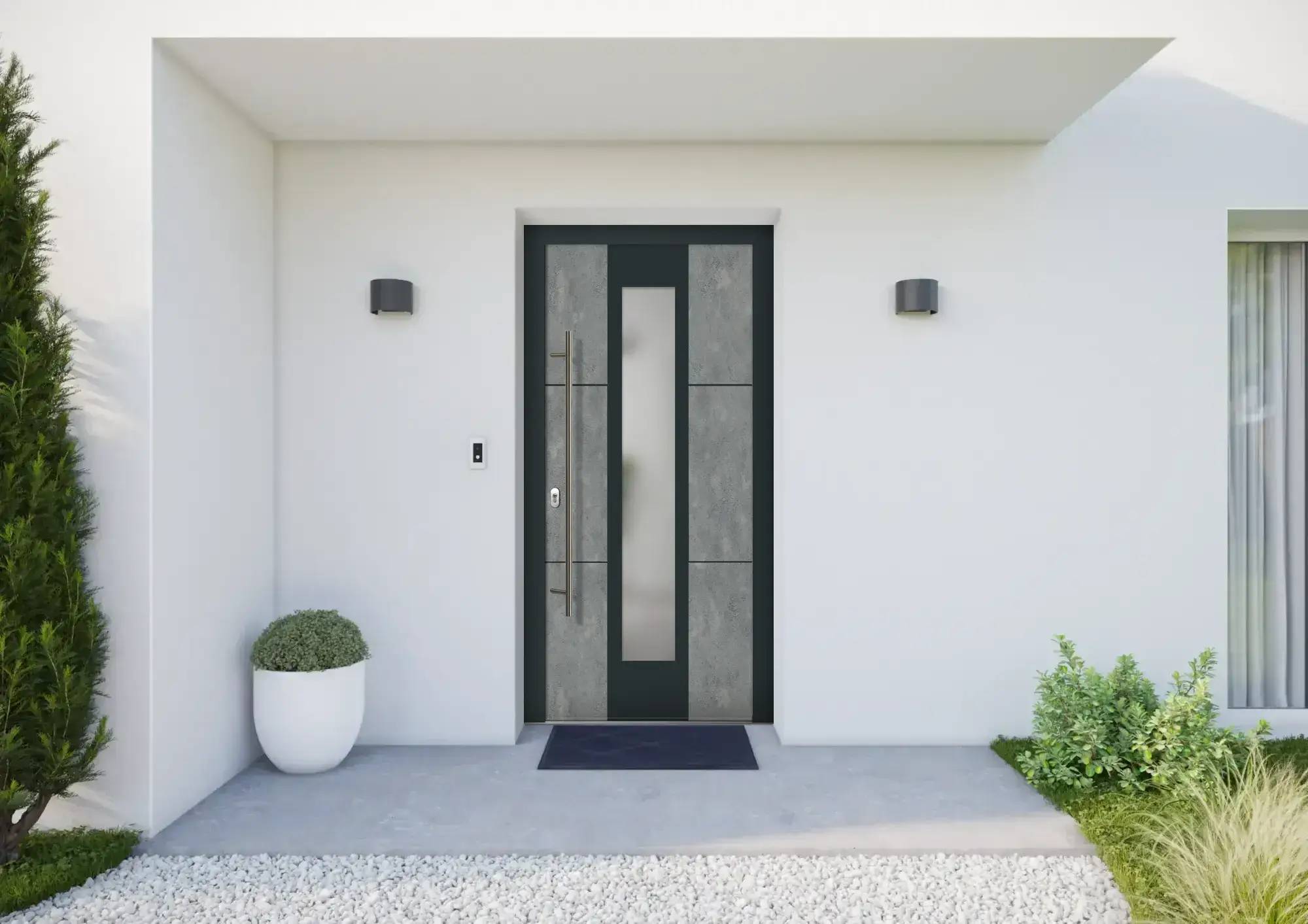 Porte d'entrée aluminium monobloc semi-vitrée Daphne beton La lumière que vous voulez, la sécurité et l’isolation que vous attendez.