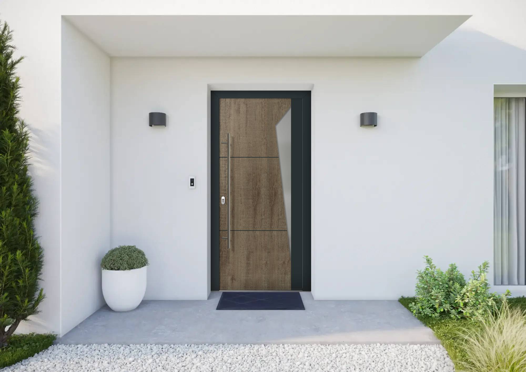 Porte d'entrée moderne blanche avec cinq fenêtres rectangulaires et une plante verte en pot à proximité.