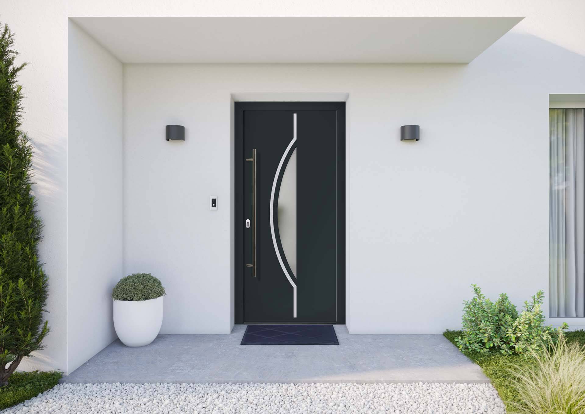 Porte d'entrée moderne blanche avec cinq fenêtres rectangulaires et une plante verte en pot à proximité.