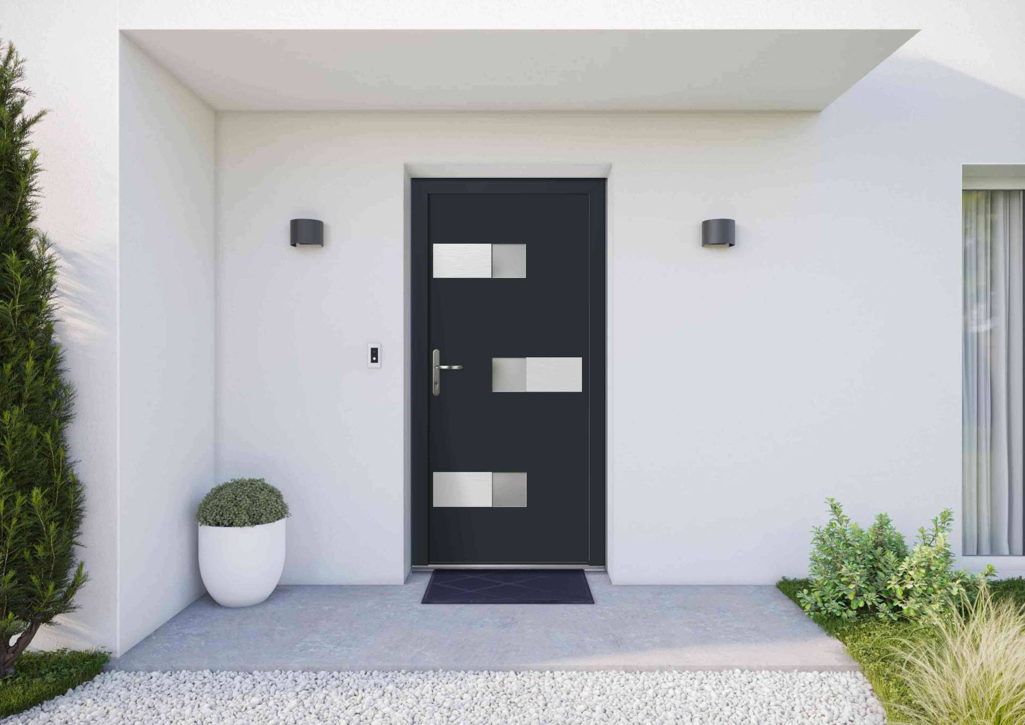 Porte d'entrée moderne blanche avec cinq fenêtres rectangulaires et une plante verte en pot à proximité.