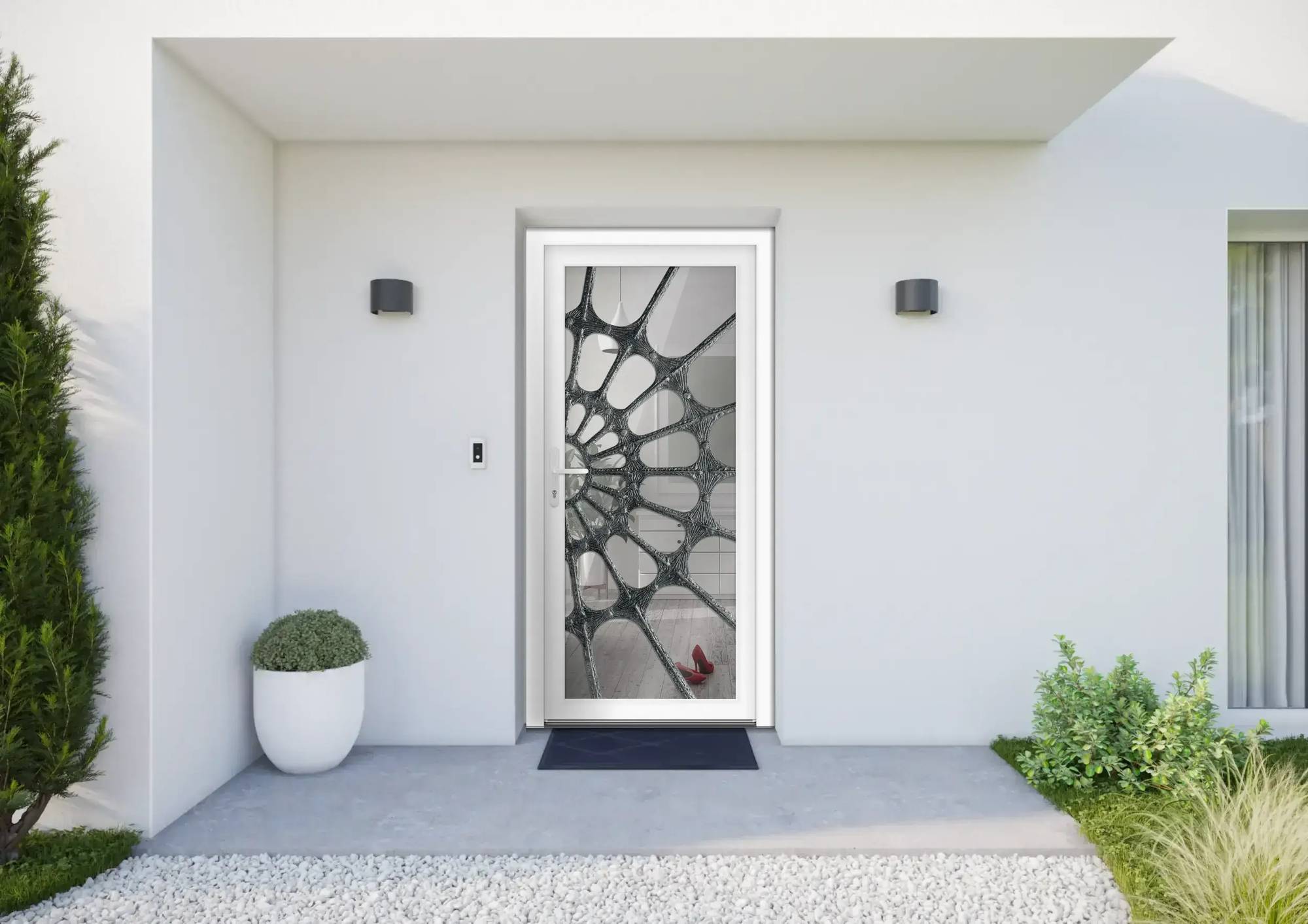 Porte d'entrée moderne blanche avec cinq fenêtres rectangulaires et une plante verte en pot à proximité.