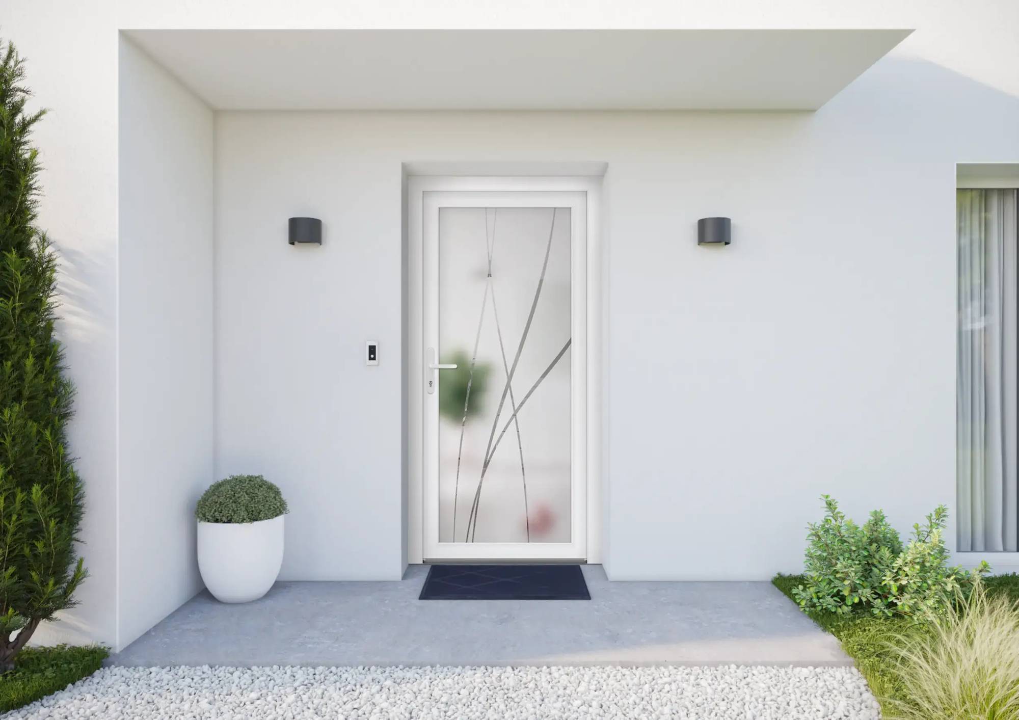 Porte d'entrée moderne blanche avec cinq fenêtres rectangulaires et une plante verte en pot à proximité.