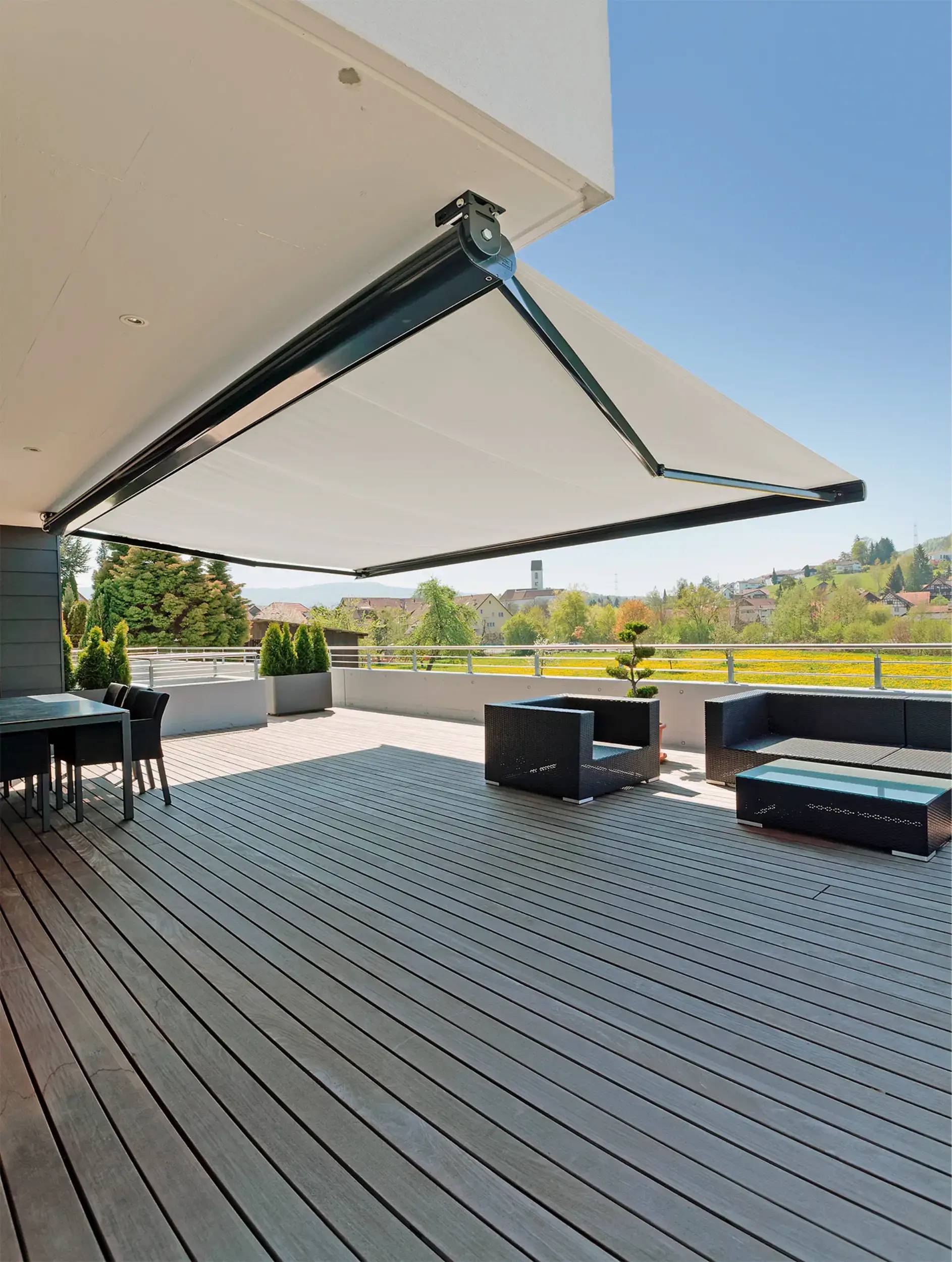 Les grandes avancées sont équipées de bras renforcés qui assurent au store une bonne tenue. Le modèle KGM5, allant jusqu’à 5m de largeur et 2.5m d’avancée est parfaitement adapté aux balcons grâce à son faible encombrement et à sa ligne arrondie qui s’intègre avec discrétion sur la façade.
